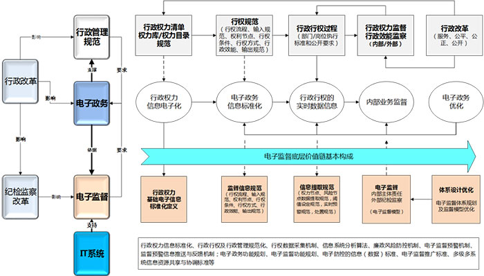 通过厘定“行政管理、电子政务、电子监督”三者的底层价值链及对应关系,构建电子监察的底层价值链、逻辑架构和电子监察平台系统结构。通过明确行政权力的监察要点—— 权力行使的“合法性、合规性、程序化、公开化、真实性”;监察重点:重点部位、重要节点的授益性权力行为节点,指导“电子监督体系的顶层设计和电子监督平台建设规划”,为电子监督平台建设奠定坚实基础。