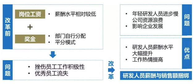 为了解决这个问题,公司领导带头在研发部门实施薪酬改革,将研发人员的薪酬与销售量挂钩,即由研发人员 按照一定比例的研发产品市场销售量,大大提高了研发人员的工资水平,提高了他们的工作积极性。