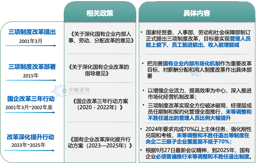末等调整和不胜任退出的要求源于“三项制度”改革,通过国企改革三年行动取得突破性成果,在国有开云app登录入口改革深化提升行动中是主体任务。