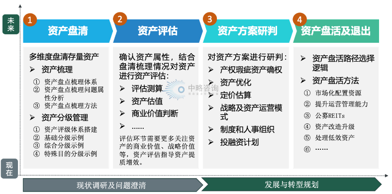 从资产盘活的路径规划上,国有资产盘活可以分成资产盘清、资产评估、资产方案研判及资产盘活及退出四个阶段:
