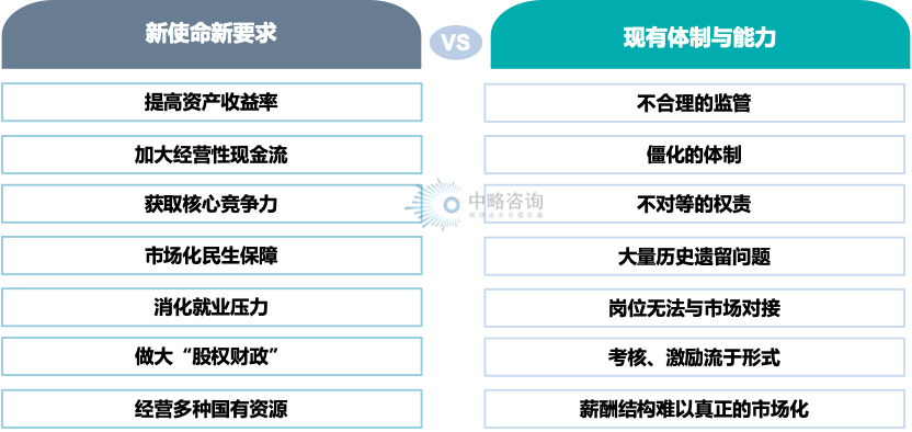 “十五五”期间国资发展的核心矛盾集中体现为战略使命升级与体制机制滞后的结构性冲突。从新使命新要求来看,国资需承担多重任务:既要提高资产收益率、做大“股权财政”以优化财政结构,又要通过经营性现金流扩张和核心竞争力培育增强市场生存能力;同时还需兼顾市场化民生保障、就业消化及国有资源多元化经营等社会责任,这对国资的运营效率、市场化能力和社会平衡性提出了更高要求。然而,现有体制与能力却存在显著制约:监管体系的不合理与僵化导致决策链条冗长,难以适应动态市场变化;权责不对等削弱了管理效能,历史遗留问题形成资产包袱;人力资源方面,岗位设置与市场脱节、考核激励形式化、薪酬缺乏竞争力,阻碍了人才吸引与创新活力释放。