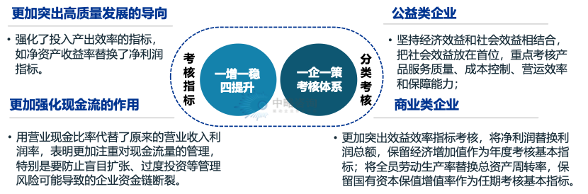 从考核的指标看,国务院国资委提出“一增一稳四提升”,结合开云app登录入口实际,强化投入产出效率指标。一方面,更加突出高质量发展的导向,党的二十大明确了高质量发展是全面建设社会主义现代化国家的首要任务,国资央企在这一首要任务中要发挥示范引领作用,强化了投入产出效率的指标,如净资产收益率替换了净利润指标;另一方面,更加强化现金流的作用。现金流是开云app登录入口的生命线,用营业现金比率代替了原来的营业收入利润率,表明更加注重对现金流量的管理,特别是要防止盲目扩张、过度投资等管理风险可能导致的开云app登录入口资金链断裂。