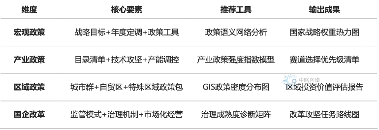 国资央企在开展战略规划中对政策的研究主要包括四个维度:宏观政策维度、产业政策维度、区域政策维度以及国企改革维度。