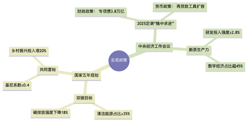 宏观政策维度以国家五年规划的战略导向、战略目标和战略项目为引领,结合年度经济工作会议定调与财政货币政策工具,构建国家发展风向标。