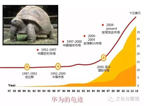 在近两年“互联网思维”漫天飞的时代,华为任正非提出了坚持做一只丛林里特立独行的龟,华为发展二十八年来就像是一只龟:认定目标,心无旁骛,艰难爬行,飘洋过海,在全球爬行,是海龟,也是陆龟。遇山爬山,遇水涉水。经得起诱惑。不投机,不取巧,不拐大弯,亦步亦趋,爬行着满足客户的需求,爬行着赚小钱。爬着,行着,追着,赶着。这只龟就超越了兔子,就变成了一只大象。在自己认定的领域坚定不移的走下去。