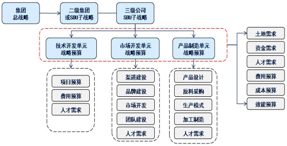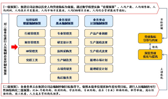 战略导向的人员编制预算思想的前提条件是:集团公司总部的战略管理与战略预算机制能够支撑将集团战略目标和战略预算从集团总部向各产业板块(拟或是二级集团或SBU)进行预算(一级预算,即,总分预算),同时,从各产业板块(或二级集团或SBU)向子公司(三级公司或二级SBU)进行预算(二级预算,二级总分预算),一级预算与二级预算相结合,构成战略导向的集团公司人员编制双向预算模式。