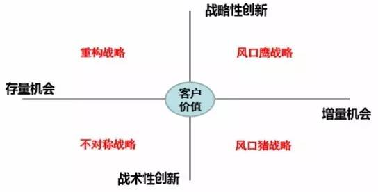 根据不同类型的机会和创新,分为了四大象限,其实这四大象限代表了四种不同的战略增长模式,即“风口鹰战略、风口猪战略、重构战略、不对称战略”。