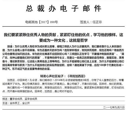 随后任正非签发了一份总裁办电子邮件,邮件正文直接转发该帖子内容,并发问:为什么破格三级的人还要离开?为什么容不得英雄?