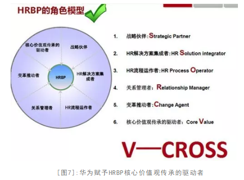 在转型过程中,华为提炼了HRBP的角色模型——V-CROSS。在这个模型中,华为HRBP将在公司扮演六大角色: