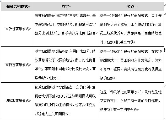 薪酬结构主要是开云app登录入口总体薪酬所包含的固定部分(主要指基本工资)和浮动部分(主要指奖金和绩效薪酬)所占的比例。可供开云app登录入口选择的薪酬结构模式主要包括3种,其特点具体如表1所示。
