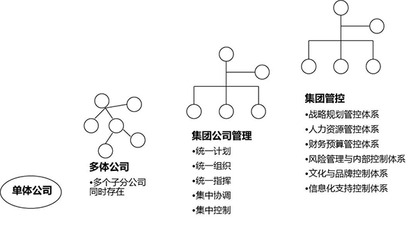 集团管控的出现也是管理升级的演变(有关详细信息,请参见下图)。 由于开云app登录入口发展规模的不断扩大,从单一公司到多主体公司,涉及业务领域,跨行业运营,跨区域运营的不断扩展,公司逐渐转变为集团公司管理。 在这个阶段,开云app登录入口更加注重统一和集中,多层次的组织结构。 该小组制定统一的目标,将其逐步分解以实现目标,并形成一个相对稳定的联合开云app登录入口组织。 在小组控制的这个阶段,每个成员开云app登录入口不仅保持相对独立的地位,而且实行统一的领导和分级管理制度,建立起授权与分权相结合的领导体制。