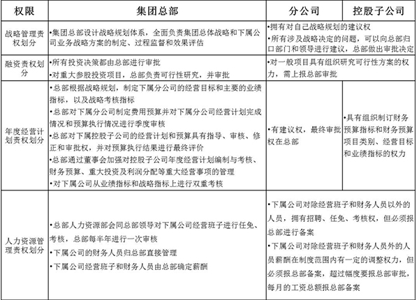 采用管控模式会有不同的责权划分体系,以战略管控型集团总部与分公司/控股子公司的权限划分,具体见下表: