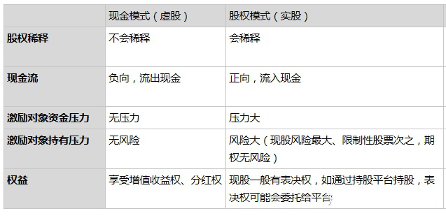 实股分配的是股份,它会造成现有股权的稀释,同时员工需要掏钱买股份,会有现金流流入;