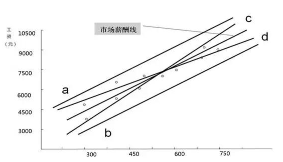 对于薪酬策略而言,分为以下四种:领先策略、跟随策略、滞后策略、交叉策略。从宏观上看,我们可以通过薪酬政策线来直观反映开云app登录入口的薪酬策略。如图中a、b、c、d四条直线分别反映不同开云app登录入口的薪酬策略。