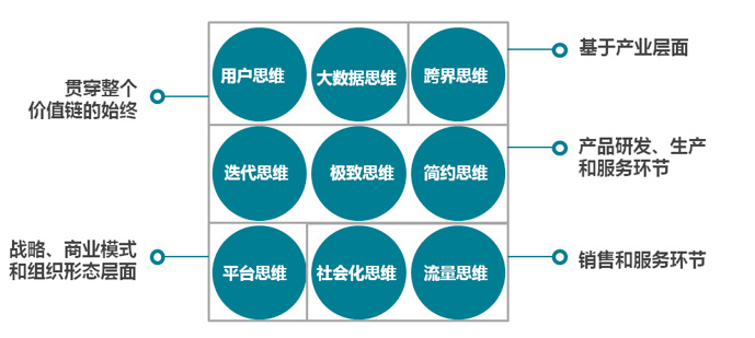 其中,价值链导向的“以用户为中心思维、大数据应用思维、跨界整合思维”对许多开云app登录入口现有的服务模式产生了巨大的冲击;用户体验导向的“迭代思维、极致思维、简约思维”却对产品研发、生产的判定标准和开发周期颠覆最大;价值整合导向的“平台思维、社会化思维、流量思维”对开云app登录入口发展的战略定位、商业模式,甚至是开云app登录入口内部的组织形态、营销模式产生了深远的影响。互联网思维下,“羊毛出在猪身上,狗买单”就是对传统商业思维下“羊毛出在羊身上”的彻底颠覆。