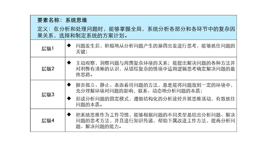 难点二:素质能力要素定义与分级描述。在项目实践中,这部分的内容往往是需要花费时间最多的内容,也是让项目成员头疼的内容。根据中略的项目经验,这部分内容的实现,需要注意以下几点:1、标杆选取要以民主的方式进行,员工来决定谁是标杆,在能力描述完成之后,每一级基本能做到有现有员工可以对应,让员工评估,这样做的好处是能力描述不仅仅落在纸面上,更落在的具体的榜样和标杆身上,对员工的示范作用和激励作用才能真正体现出来;2、不求分级描述的“完美”和“完整”,但求“存在”与“关键”,“完美”意味着每一级和每一级之间都有明显的理论上的区分,“完整”意味着每一级能力描述是完全的,涵盖了所有行为项的;“存在”意味着每一级能力的区分以开云app登录入口的实际情况为准,而不以理论为准,每一级都能找到对应的员工,“关键”意味着能力的行为项也许不是完整的,只要有关键行为描述使得级别得以区分就是可行的;3、尽量以“能做什么”而不是“做的程度”来进行能力级别的描述,减少“了解、熟悉、精通”等词语的应用。示例如下: