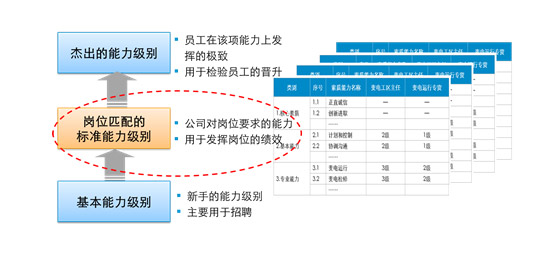 将素质能力模型与各类岗位进行分级匹配以明确各类岗位所需具备的标准能力,即在岗位发挥正常绩效所需要的能力级别。在实际判别时,一定要进行广泛的调查研究、人员访谈,匹配的成功度跟匹配本身的合理性有关,更跟获得的人员的支持率有关,从一定程度上讲,匹配过程是一个主观的过程,而不是一个客观的过程,这并不违背素质模型在职业发展通道、培训体系中的作用发挥。