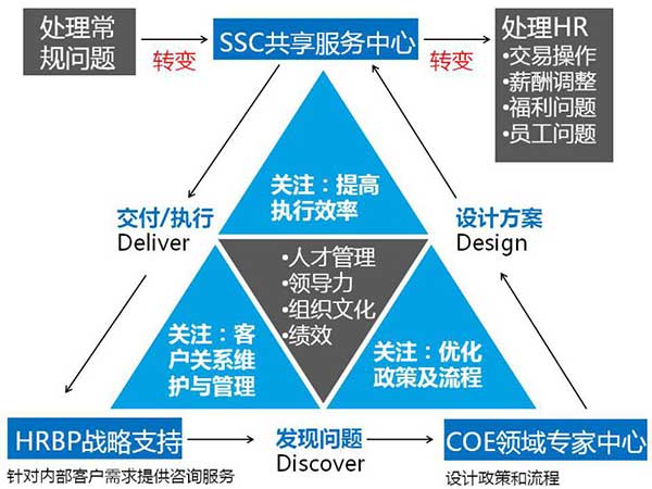 HRBP可以有效地解决这一矛盾。戴维尤里奇教授提出了HR 部门的组织架构再设计框架,几经完善,演变成为今天在大型开云app登录入口中流行的三角模型,如下图所示: